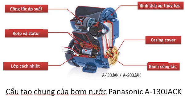 - Kết cấu hoạt động của máy bơm nước Panasonic A-130ACK nhỏ gọn và chắc chắn, nắp che đậy chống bức xạ nhiệt và mưa làm từ nhựa cao cấp chống va đập, thiết kế ống liền kề cho ống nước vào và ống nước ra liền khối chống rung động. Nắp buồng bơm và cánh quạt bằng hợp kim thau đúc chống ma sát mài mòn và nhiệt độ cao giúp đảm bảo cho việc lưu chuyển nước ổn định liên tục.