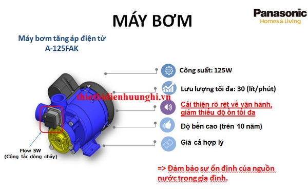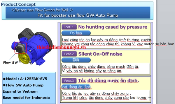 - Dòng máy bơm nước áp lực thế hệ mới, điều khiển hoạt động tăng áp tự động với mạch điện tử ứng dụng công tắc dòng chảy ( flow water switch ) không gây ra hiện tượng đóng mở công tắc thường xuyên ( tạo tiếng ồn nhịp công tắc liên tục ) dễ gây suy giảm chất lượng máy bơm nước.